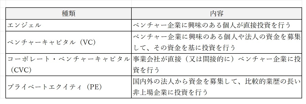 なお、ベンチャー投資というと、ベンチャーキャピタル(Venture Capital:VC)をイメージする人が多いと思います。VCはベンチャー企業に投資する投資ファンドです。老舗企業に投資する代表的なファンドはプライベートエクイティ(Private Equity:PE)です。