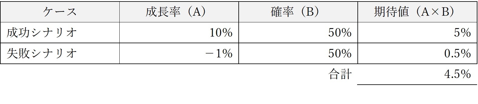 老舗企業Y社の新規事業が成功すると売上・利益は10%成長し、失敗すると-1%成長します。Y社の成功・失敗の確率がそれぞれ50%、50%なので、投資家の期待する成長率は4.5%です。