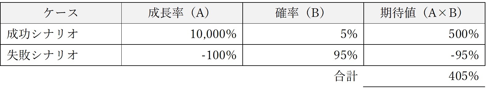 X社の成功・失敗の確率がそれぞれ5%、95%なので、投資家の期待する成長率は405%です。すなわち、X社は95%の確率で倒産するものの、期待値として4倍(405%)成長すると投資家は考えているのです。