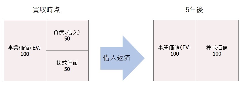 買収資金100は自己資金50と銀行借入50で賄いました(LTV50%)。