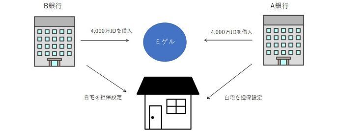 「ミゲルは自宅を担保にして、A銀行から4,000万JD借りている。その後、ミゲルは自宅がA銀行の担保になっていることを内緒にして、B銀行から4,000万JD借りたとする。」