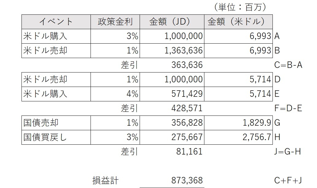 内訳は政策金利の引下げ時の米ドル売買から3,636億JD、政策金利の引上げ時の米ドル売買から4,286億JD、国債の売買から811億JDだ。
