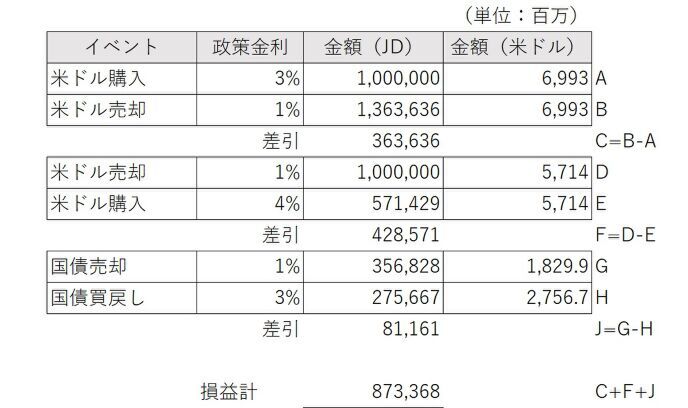 結果的に、米ドルの空売りと買戻しによる損益は4,286億JD(=1兆JD-5,714億JD)となった。