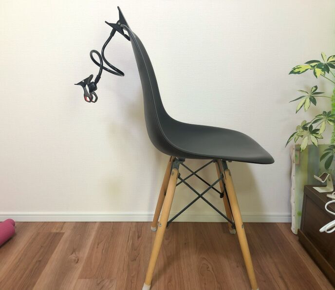 60センチの高さを確保するためには、60センチよりも高いところからカメラを出さないといけない。スマホホルダーやアーム式スタンドだと高さが足りないから、椅子に可動式のスマホホルダーを設置する。