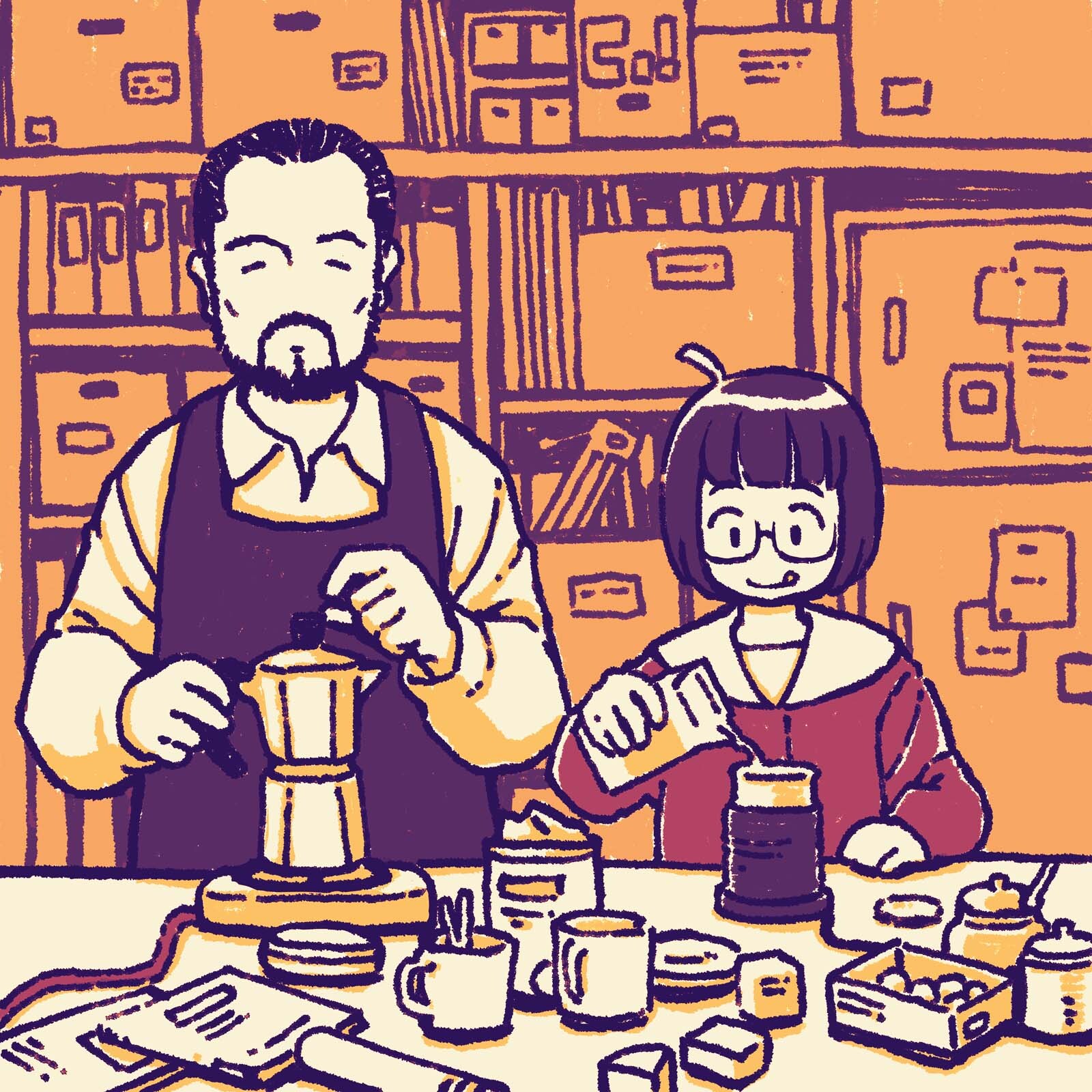 方言を交えて話しながら、若城さんは豆を挽いて直火式のエスプレッソメーカーでコーヒーを淹れる。