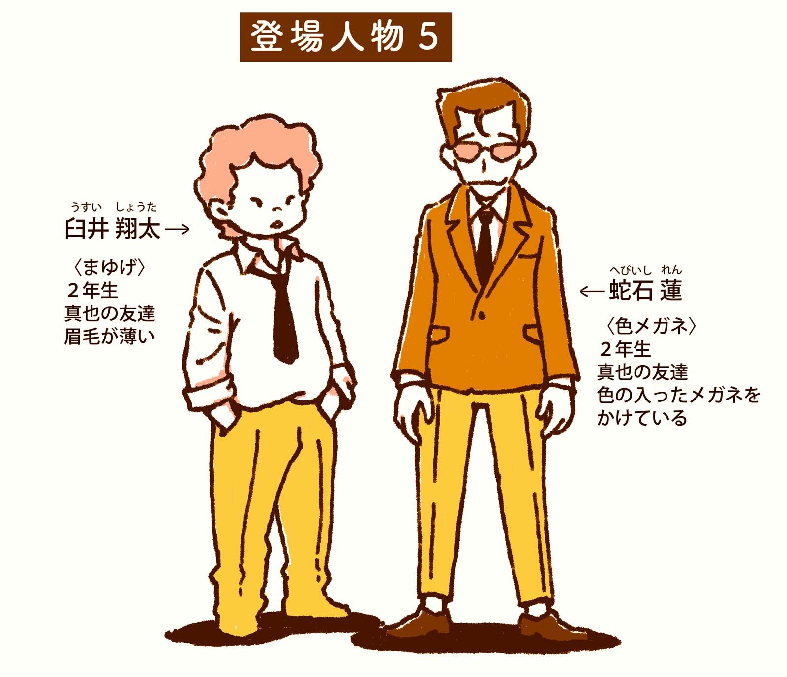 ひとりは眉毛が薄いのが目立っていて、もう一人は青系の色レンズが入ったメガネが特徴。