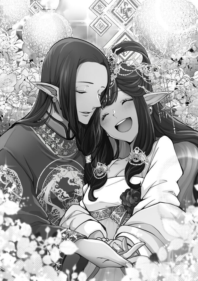 円卓には、黒龍族の伝統である婚礼用の食事と酒が並び、二人は赤い絨毯の先で、涙ぐむ両親が座る場所までゆっくりと歩んだ。