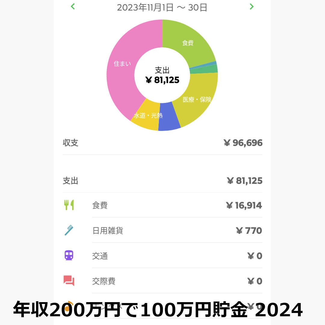 旅行へ行かなかったので通常月収支を計算、昨年11月は96,696円程貯金できたという事。