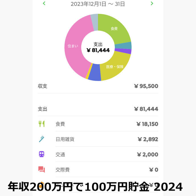 年賀状や切手代があったので通信費がかかったけれど、昨年12月はだいたい95,500円貯金できたという事。