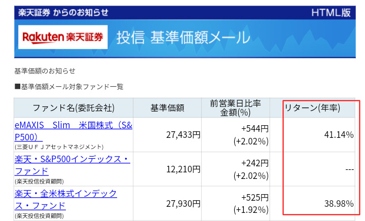 楽天証券が日曜以外の毎日「投信基準価額メール」というのを送ってくれる。