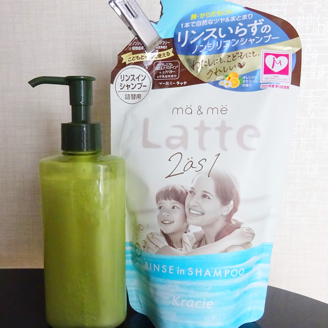そこで目に付いたのは、「マー&ミー Latte 親子で使える リンスインシャンプー ノンシリコン マーアンドミー ラテ」詰め替え用550円(税抜)。