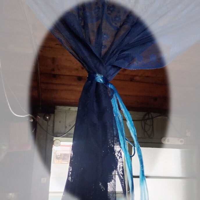 掃除する場所に明かりが入りにくく、ゴミの目隠しカーテンが邪魔で、姉はビニールひもを探して来て、カーテンをまとめた。