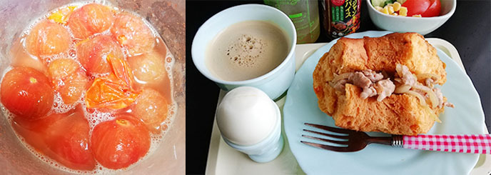 *cap プチトマトを湯向きし、砂糖をかけてスイーツのドレンチェリー代わりにしようとしたら、発酵したので、トマトパンを焼き、業務スーパーのケイジャンスパイスで合えた前日の夕飯の残り肉を挟んだ。これが臨機応変