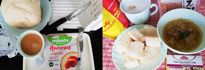 *cap 水170cc+強力粉250g+塩小さじ2/1+サラダ油15g+ドライイースト3gをHBで焼いた食パン、膨らみは悪いが、フムスレッドチリ(ご飯にも合う)やトムヤムクンと一緒の為、塩分調整。干しエビはカルシウム補給にスープへ