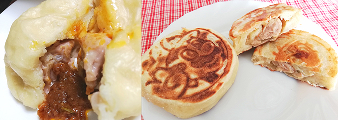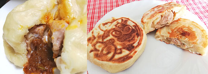 *cap ソースを掛けた鶏肉まんとホットクッカーで焼いたチキンマリオまん