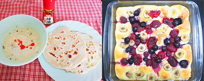*cap 左:本物を知らない鹹豆漿と葱油餅もどき 右:適当にフルーツを載せて焼いた菓子