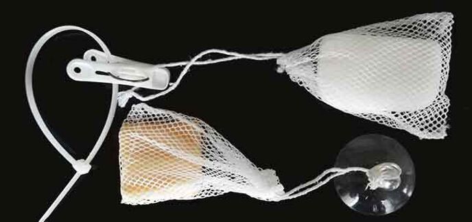 いわゆる学校のレモンソープをミカンのネットに入れて水道の蛇口にぶら下げているのと同じ。