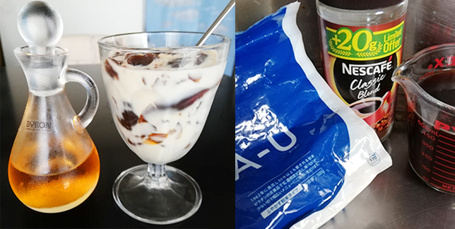 クラッシュしたコーヒーゼリーに牛乳を注ぎ、自家製三温糖シロップを加えてゴクゴク飲むと、お腹がいっぱいになり、ご飯不要、お菓子よりもカロリーが低く、美容と健康にお勧めドリンクである。