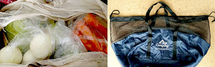*phot071 左:冷蔵庫野菜室使用中の100均レジカゴバッグ 右:DAISOレジカゴバッグ300円、上部メッシュは同じだが厚手で向いてないから銭湯やコインランドリー等で使用