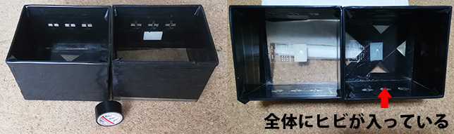 何年も前に買った100円ショップのプラスチックケースがメリメリと音を立ててヒビが入り、車のガラスみたいに壊れた。