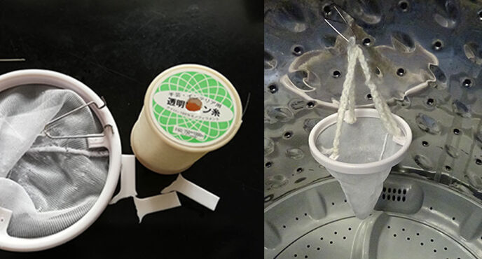 くさり編みをしていた毛糸があったので、キリで穴を開けたプラスチック部分に針を通して毛糸を結んだら、強度も増し、激しい洗濯機の回転に耐えた。