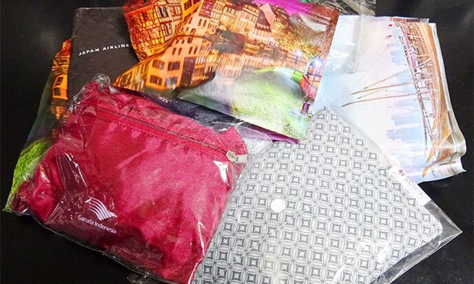 飛行機で貰うアメニティポーチ、無料ながらファスナーやボタンが付いて、普段使いポーチとして、ポケッタブルジャケット等を入れたりできそうな作りが有用。