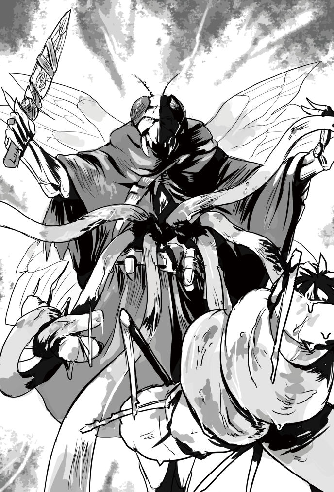 そんなオーガと対峙しているフィリポの姿は、輪をかけて痛々しい。右腕の肘から先がねじ切られ、背中の翅の左半分は根元から引き抜かれている。複眼も一つ潰されており、溢れ出した青い血が体の半分を濡らしていた。