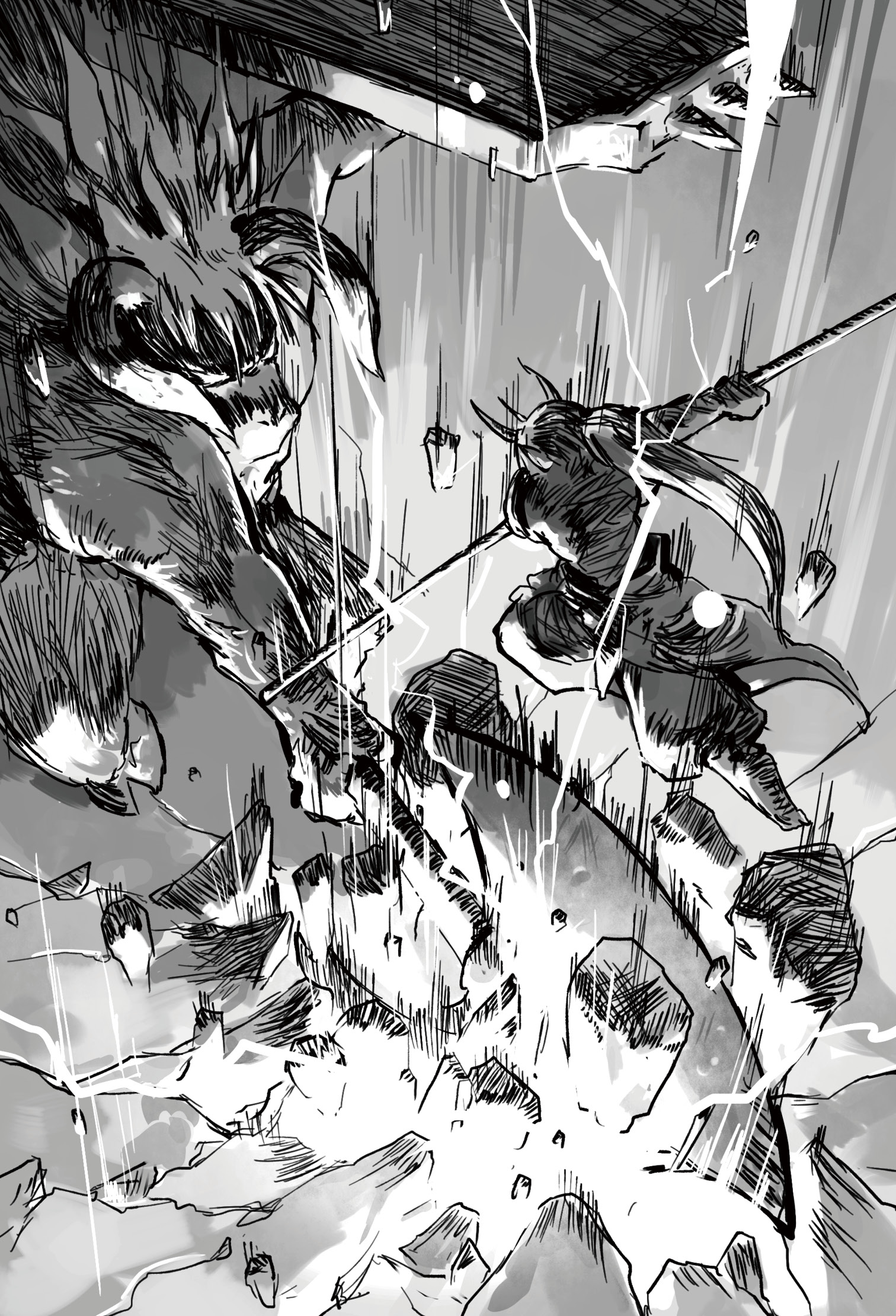 両者の間にあった二〇メートル程度の空間はたったの数歩と刹那の間に埋め尽くされ、その巨躯がアポ朗の目前に迫る。轟、と勢いよく振り下ろされる斧――全てを叩き砕く殲滅の斬撃。