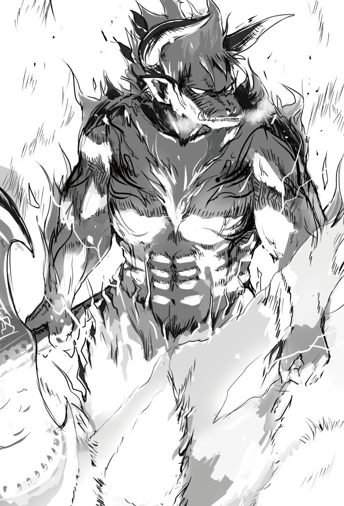 斧の一振りと同時に黄金の雷光が走り、刀身から白い炎が噴出して敵の身を焼いた。