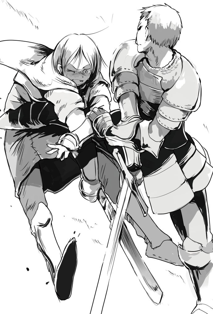 ミスラル合金製の長剣はゴウッ、と鋭く力強い風切り音を上げながら対戦相手――赤い短髪の女にその刃を食い込ませようと猛る。跳び起きざまの切り上げ攻撃は、まるで肉食獣が獲物の喉に飛び掛かるような姿だ。