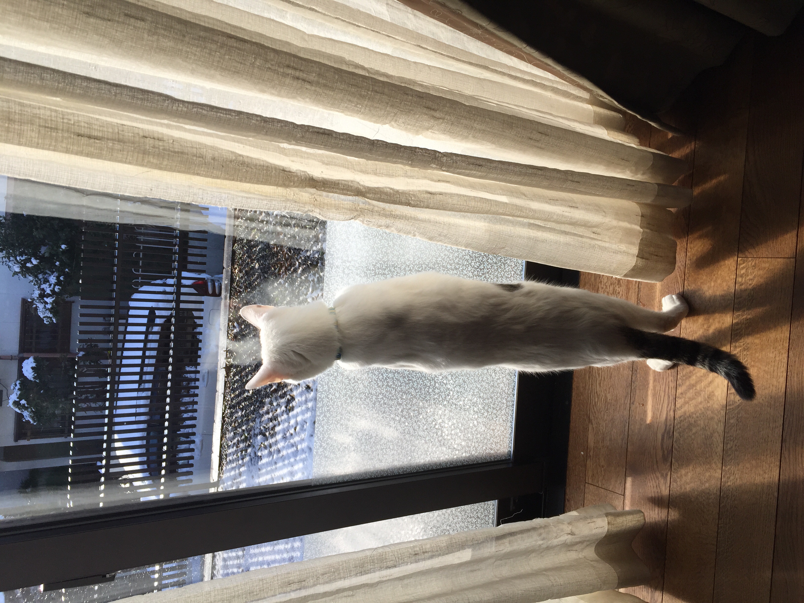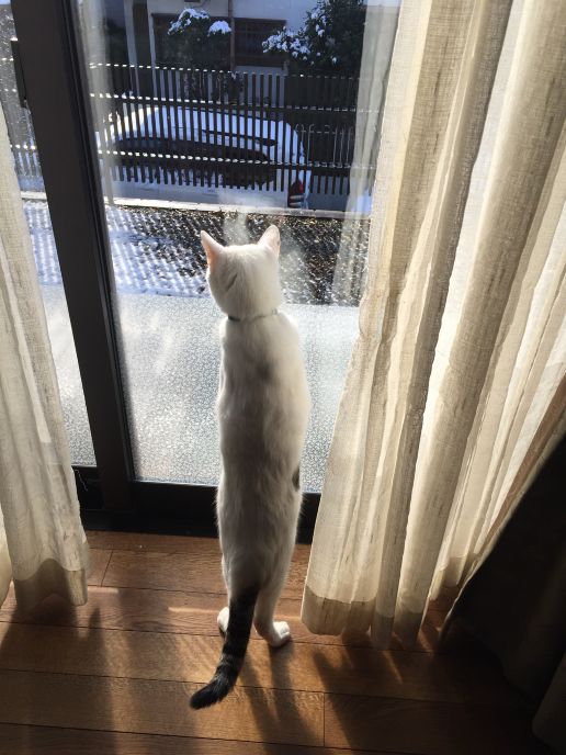 しかし、大抵、数分もしないうちに、もう一度、窓際に来てにゃー(外に出して)とねだるのである。さっき出たばかりだろうと、訴えを無視していると窓のカーテンに爪を立てカーテンをボロボロにするし、何度もしつこく、にゃー、にゃーと訴えるので、早々に訴えを聞き入れ、もう一度外に出してあげるのが、日課である。言葉こそ話せないが、人間と猫という異種族間でこのようにコミュニケーションは成立してるのである。
