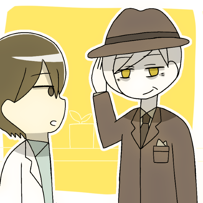 リビングに入ると、一足先に帰った水銀が誰かと向かい合っているのが見えた。それは品のいい茶色のスーツとフェルトハットを身に着けた、白髪の初老の男性だった。