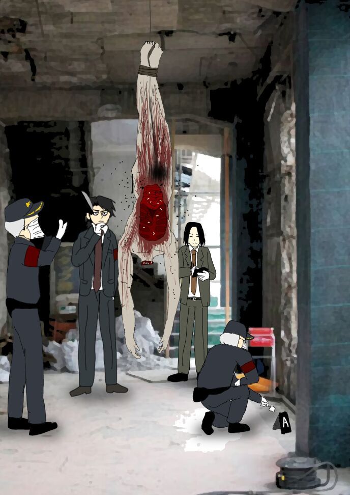 彼は黄色いテープを潜り抜けて現場へ入ると、鑑識が路地裏で吐いているのが見えた。
