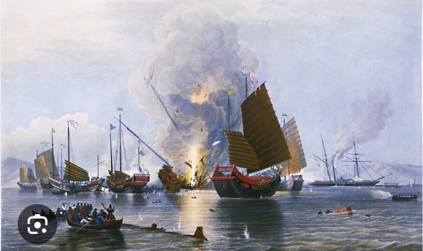 清王朝も道光帝の命を受け、軍隊を派遣。アヘン戦争が勃発。清王朝は厦門・寧波などの揚子江以南の沿岸地域を死守しようとしたが、産業革命で発展したイギリス海軍との兵力差は歴然で、清王朝海軍のジャンク船は次々と海に沈められた。