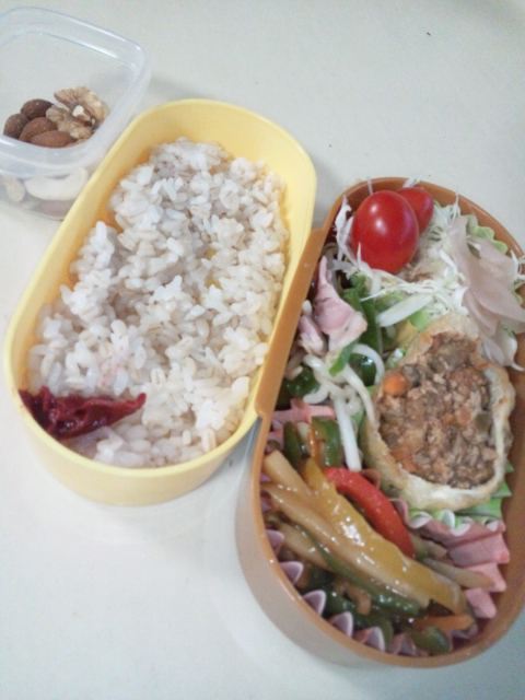 夜に作り置きした青椒肉絲、揚げのミートソース詰め、もやしとピーマンとベーコンのコンソメ蒸し、キャベツの千切り、ミニトマト、そして自家製ガリ。