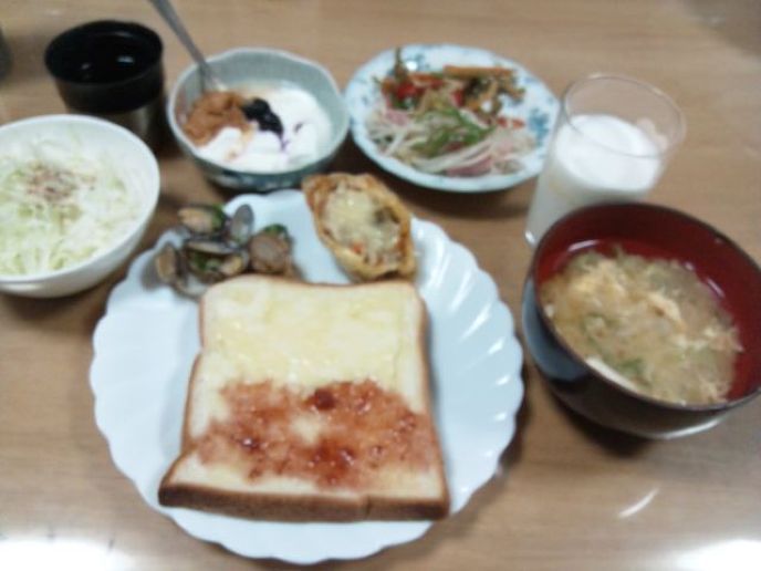 ダイエットを始めてから六枚切りから八枚切りへと変更した食パン。マーガリン、いちごジャム、チーズ乗せ。