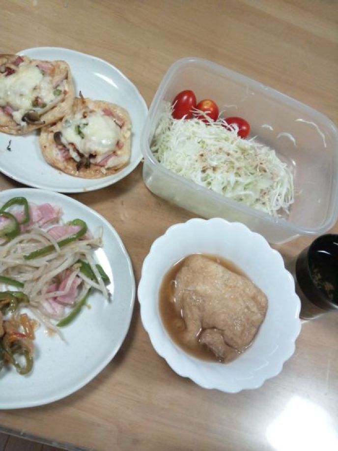 この日は、他にもやし、ピーマン、ベーコンのコンソメ蒸し。青椒肉絲。モチ巾着、卵巾着を和風だしの煮込み、前日に作ったミートソースを二つに切った揚げの中に詰めオーブンで焼いたもの。といつもより沢山おかずを作りました。