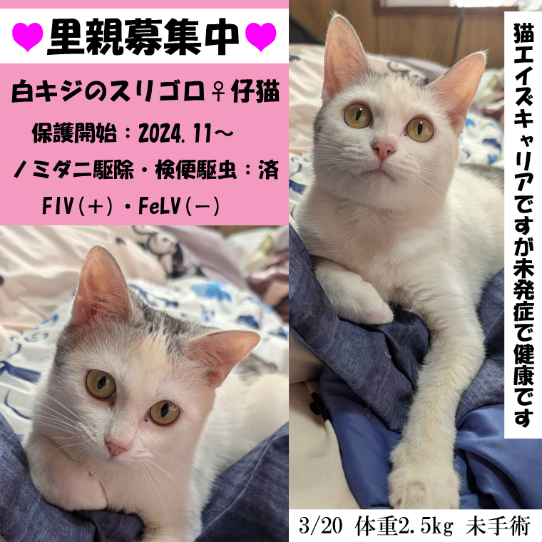 TNR現場から保護された仔猫で、猫エイズキャリア。