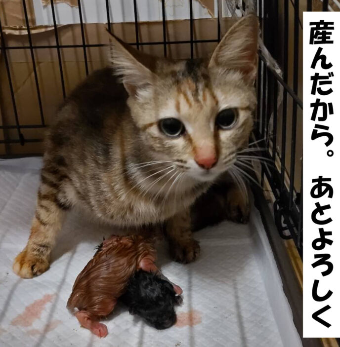 TNR搬送用のSケージで産み始めていたので、抱き上げて保護用Mケージに移動させました。