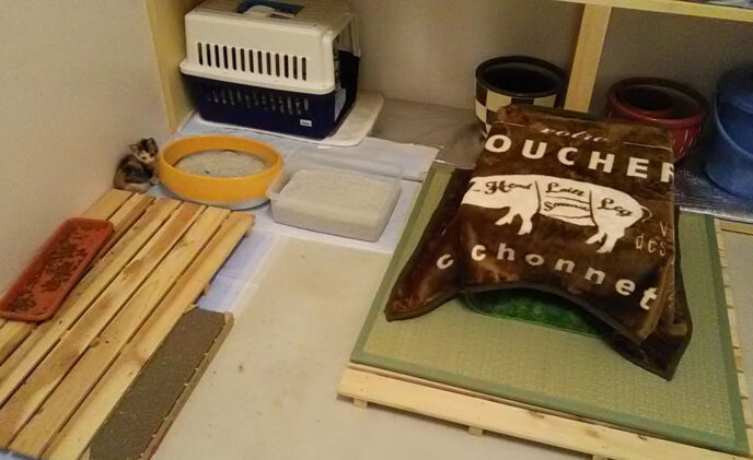 自治会長から「保護して里親探しをしたらいいよ」と言われ、自宅ガレージにスノコと畳を敷いて保護部屋を作り、1室フリーで保護開始。
