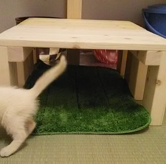 簡易猫部屋と肩の上で眠る仔猫たち「トラ」「シロ」