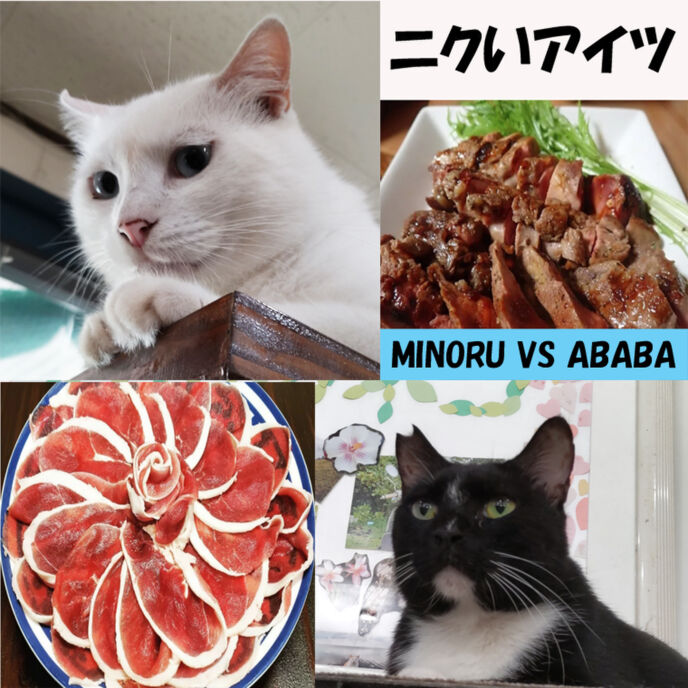 彼の小皿に先に肉を置いて、ミノルがそれを食ってる間にアババに肉をあげようとしたら、アババは意趣返しとばかりにミノルの皿から肉を奪った。