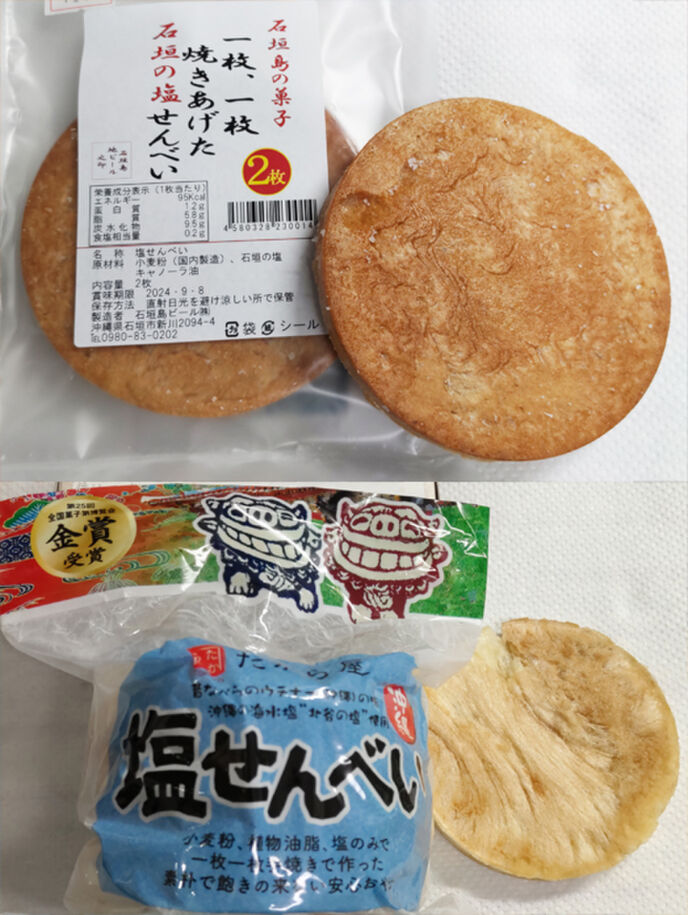 沖縄のスーパーに売っている「塩せんべい」は、小麦粉で作られています。