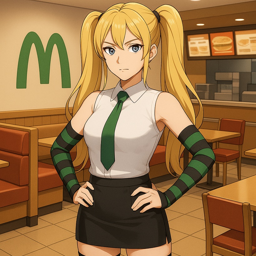 鮎美が猛烈に聴きたそうな顔になると、ミクドナルドは微笑して前屈みになる。鮎美とミクドナルドには頭二つ分ほど身長差があり、屈むとようやく同じ高さになる。二人の顔が近づき、黒髪へ金髪が触れた。そして小声の英語で囁いてきた。
