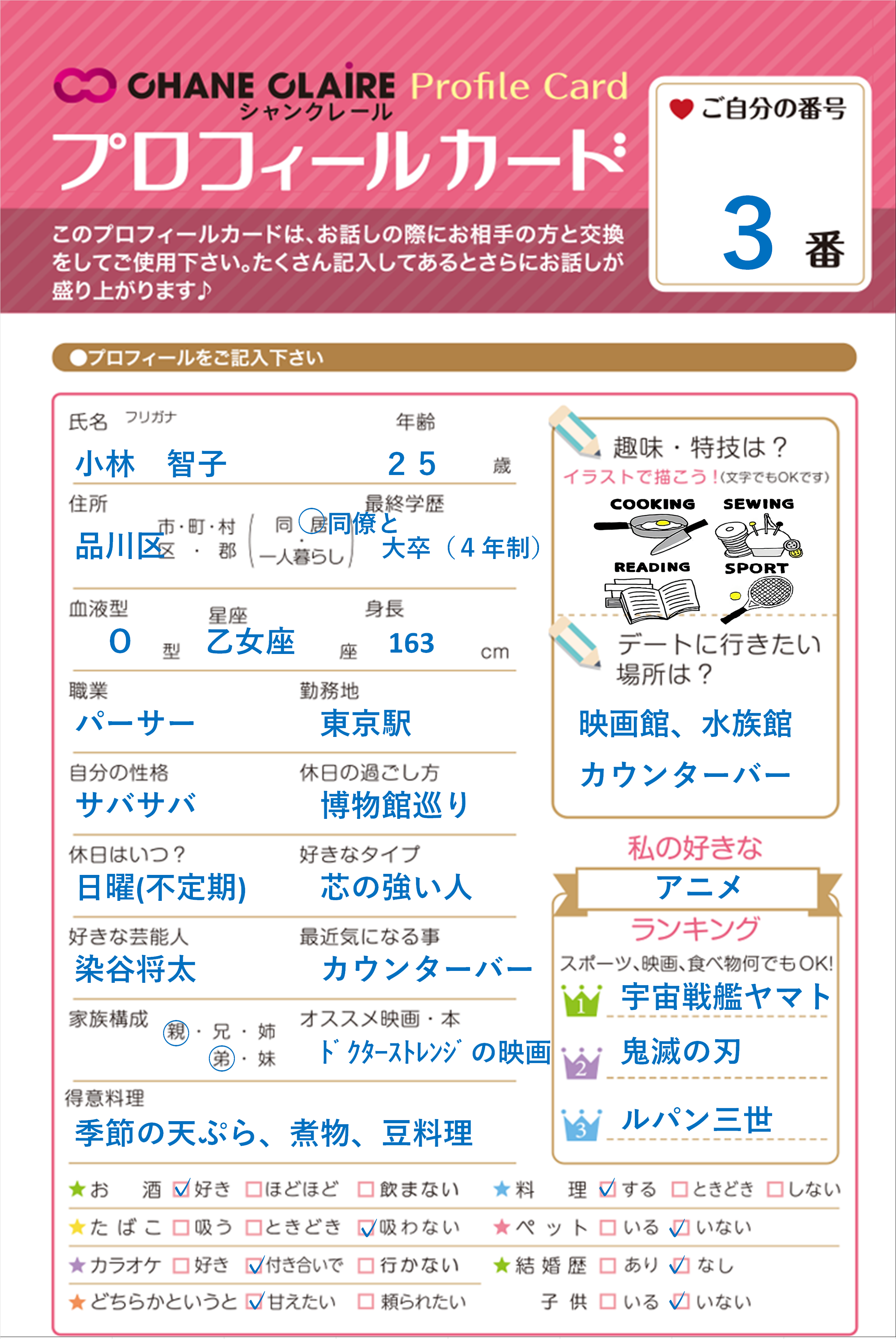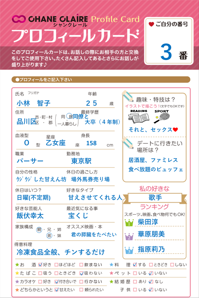 「へへ、え~、私、いつも持っているんですよ。印刷して大量生産。書くのも面倒なので。婚活で会った人に話しの接ぎ穂で渡すんですよ・・・これです!」