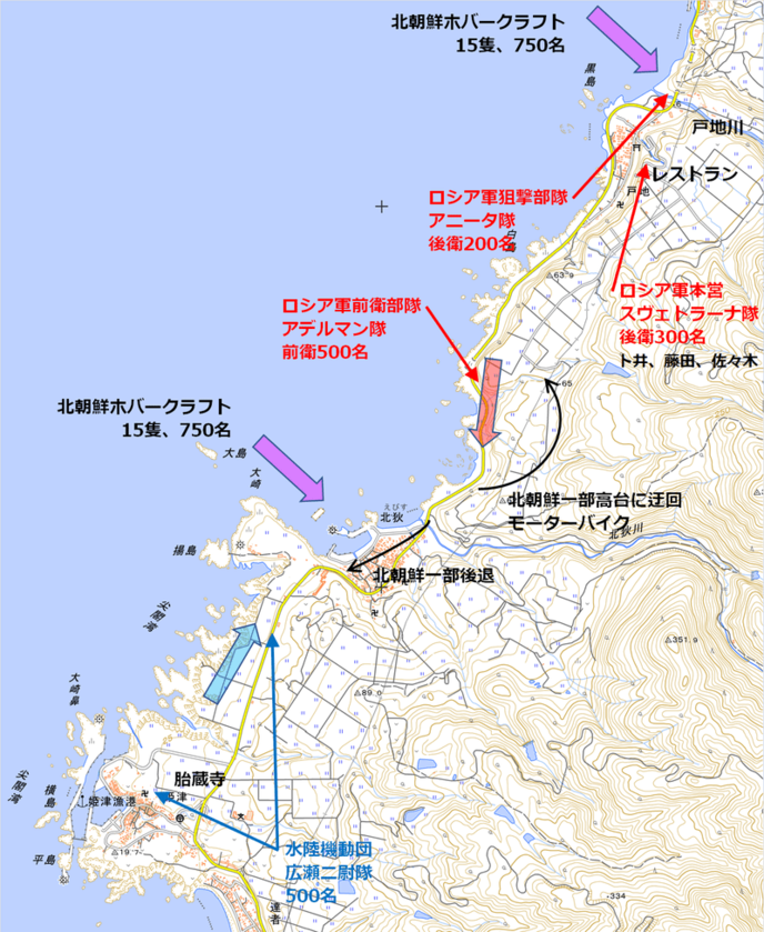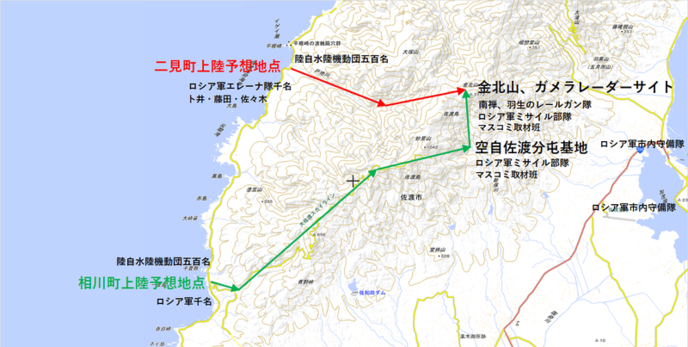 「じゃあ、准尉、佐渡一周線の道路上は交戦地帯だ。道路の上の台地の田んぼ沿いの農道を進むんだ。姫津漁港には広瀬二尉の水陸機動団がいる。佐渡一周線脇の胎蔵寺に本営がある。姫津漁港からは佐渡一周線でしばらく行けるだろう。相川町も北の上陸でかなりやられている。相川町の佐渡市役所相川支所に水陸機動団とウラジミール中佐の隊がいるから、そこでルートを確認しろ。それから、大佐渡スカイラインには行かず、佐渡一周線を通って市内に行き、両津港の佐渡市立両津病院まで行くんだ」