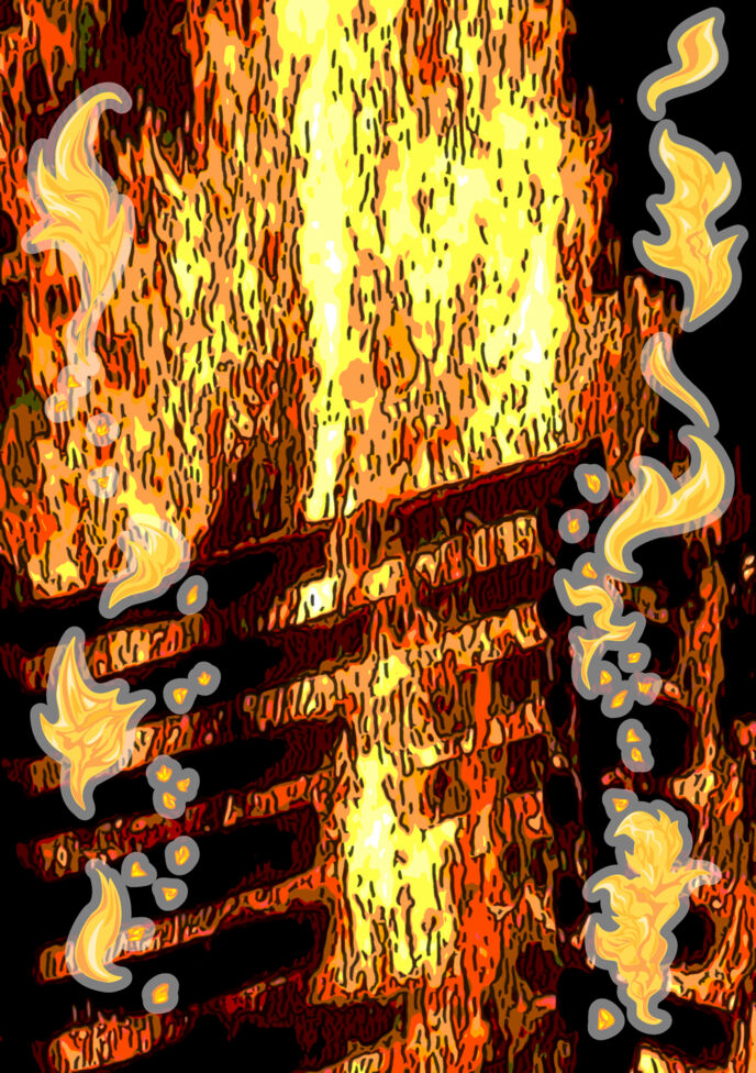 寒々しいながらも澄んだ暗色の夜空、斬り裂く炎は山ごと抱き立ち昇る。