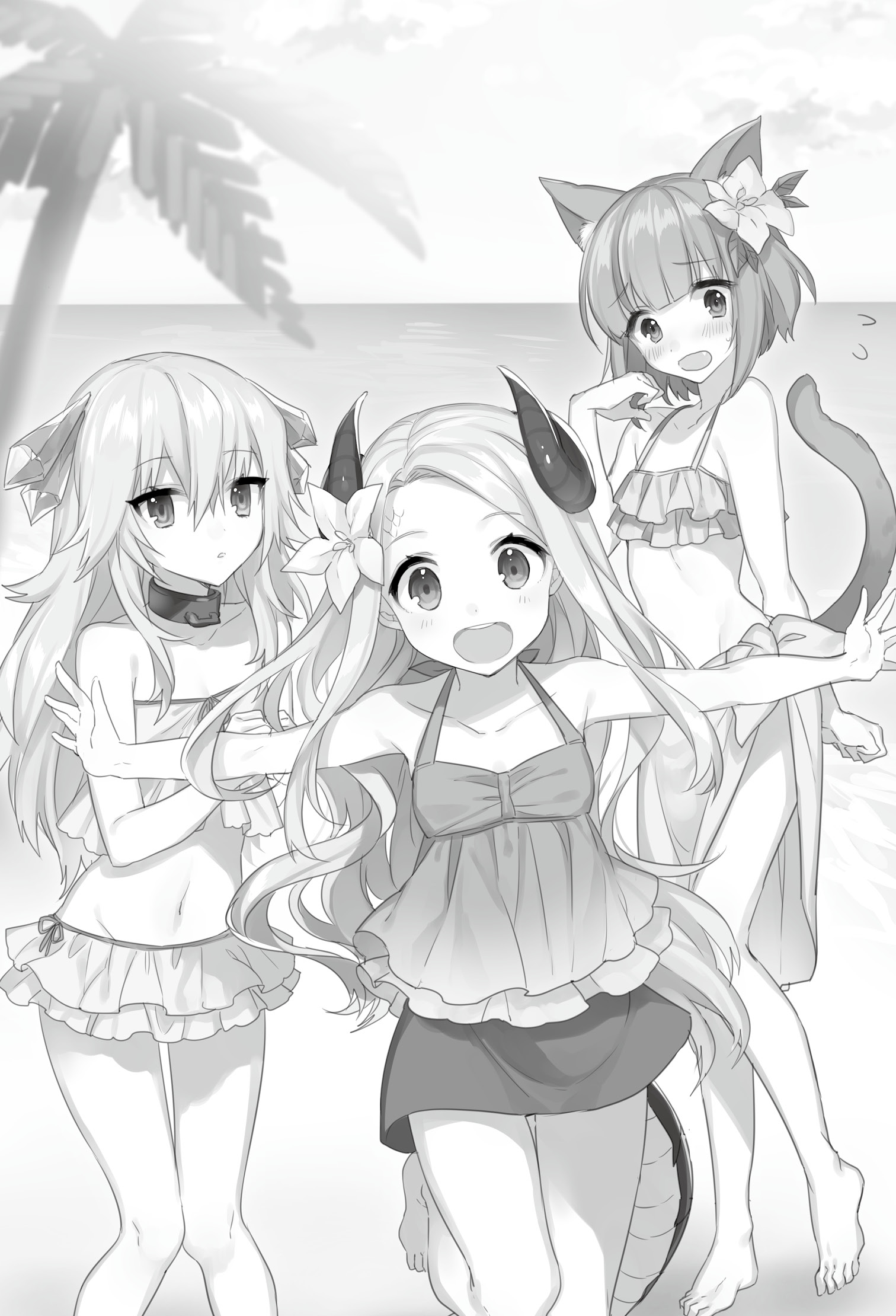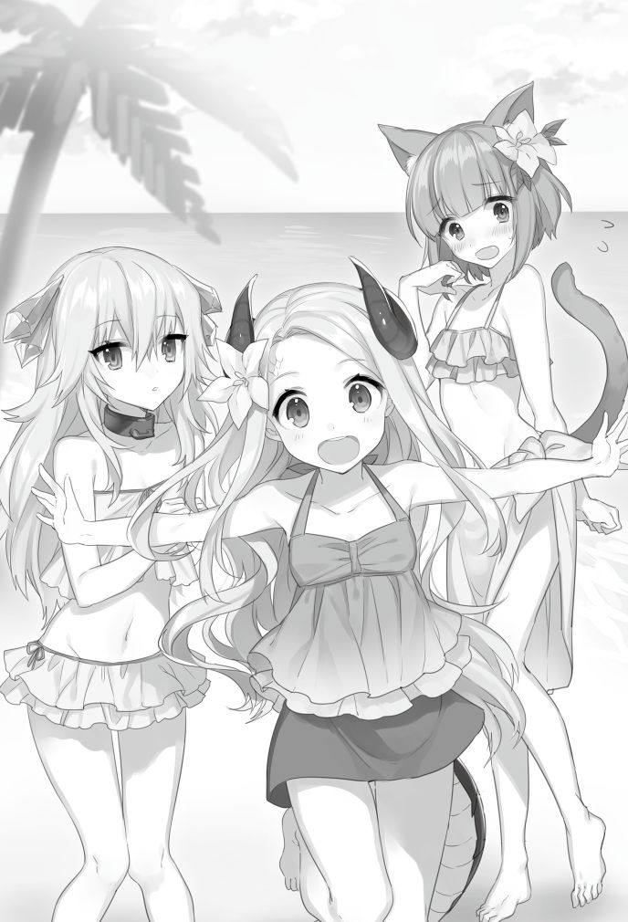 ただ、スカート部分が短いのが気になるらしく、メオはしきりにお尻の辺りを見ている。どうやらスカートの下には紐パンツ型の水着を穿いているようだが、アイジャと違いメオは下着を穿き慣れていない。尻尾を動かすたびに、健康的な太股がちらちらとスカートの下から見えてしまう。