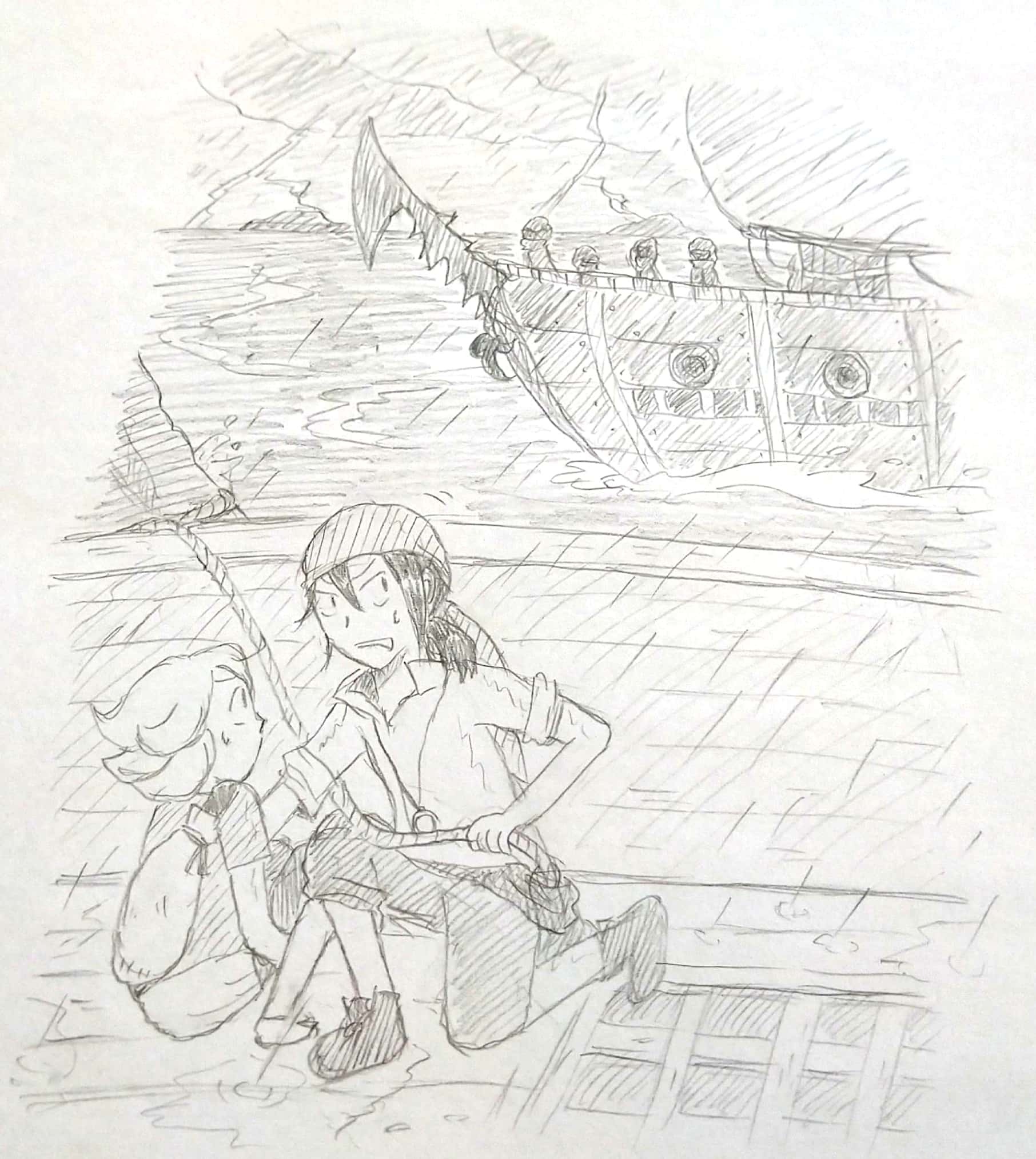水平線の向こうから、大型帆船の集団がこちらにやってくる。どの帆船も船体から帆に至るまで真っ黒な色をしており、ギザギザした形の船首と大きな大砲を持っている。甲板には黒ずくめの服を着た人……と思われるものがずらりと並んでいる。