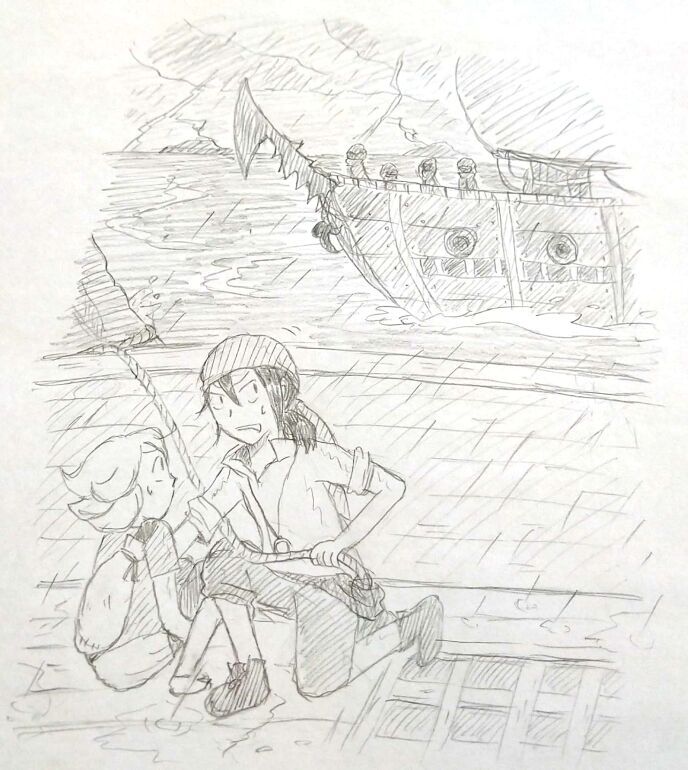 二人が息を殺してじっと隠れていると、その横を黒い帆船が次々と通り過ぎていく。